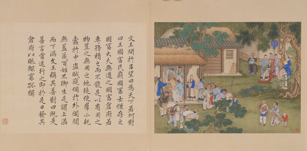 历代统治者在儒家经典中寻求治理国家的答案,不断加强儒学修养。自汉唐以来,古代帝王为讲经论史而特设御前讲席,是为经筵制度。展品中,明代徐显卿的《宦迹图》中有一幅描绘为万历皇帝经筵的场景:万历皇帝端坐于御座上,徐显卿担任展书官,立于御案之前,左右两侧文官与内侍林立,秩序井然。