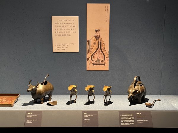 日本江户时代初期,以儒教治国的第五代将军德川纲吉建立汤岛圣堂,作为讲授以孔子为代表的儒学和祭祀孔子的建筑场所,是东京的孔子庙。展览中,来自东京国立博物馆的文几、料纸、砚箱、爵、象尊、牺尊,都是汤岛圣堂举行祭孔大典时使用的礼器,由当时各地大名进献。