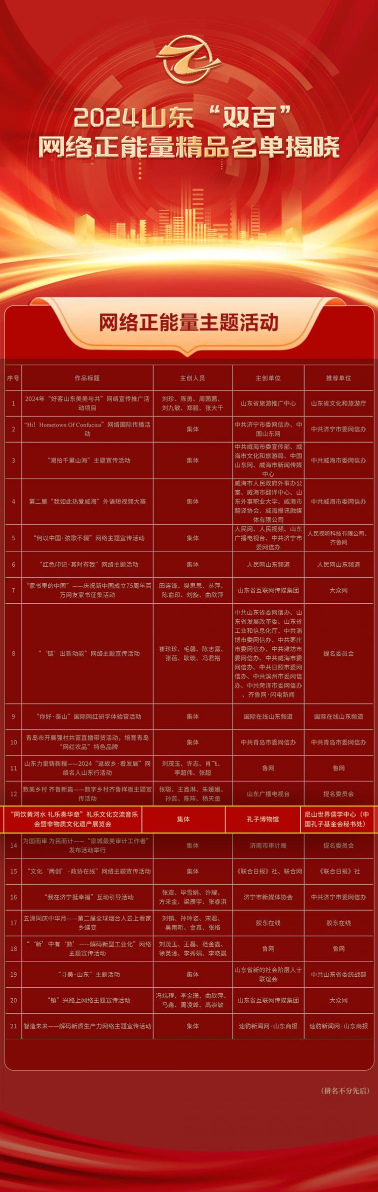 近日,山东省委网信办揭晓了2024山东“双百”网络正能量精品评选活动结果,尼山世界儒学中心(中国孔子基金会秘书处)荣获三项殊荣。《尼山讲堂》《每日论语》被评为“正能量专题专栏”,“同饮黄河水 礼乐奏华章”礼乐文化交流音乐会暨非物质文化遗产展览会荣获“正能量主题活动”。