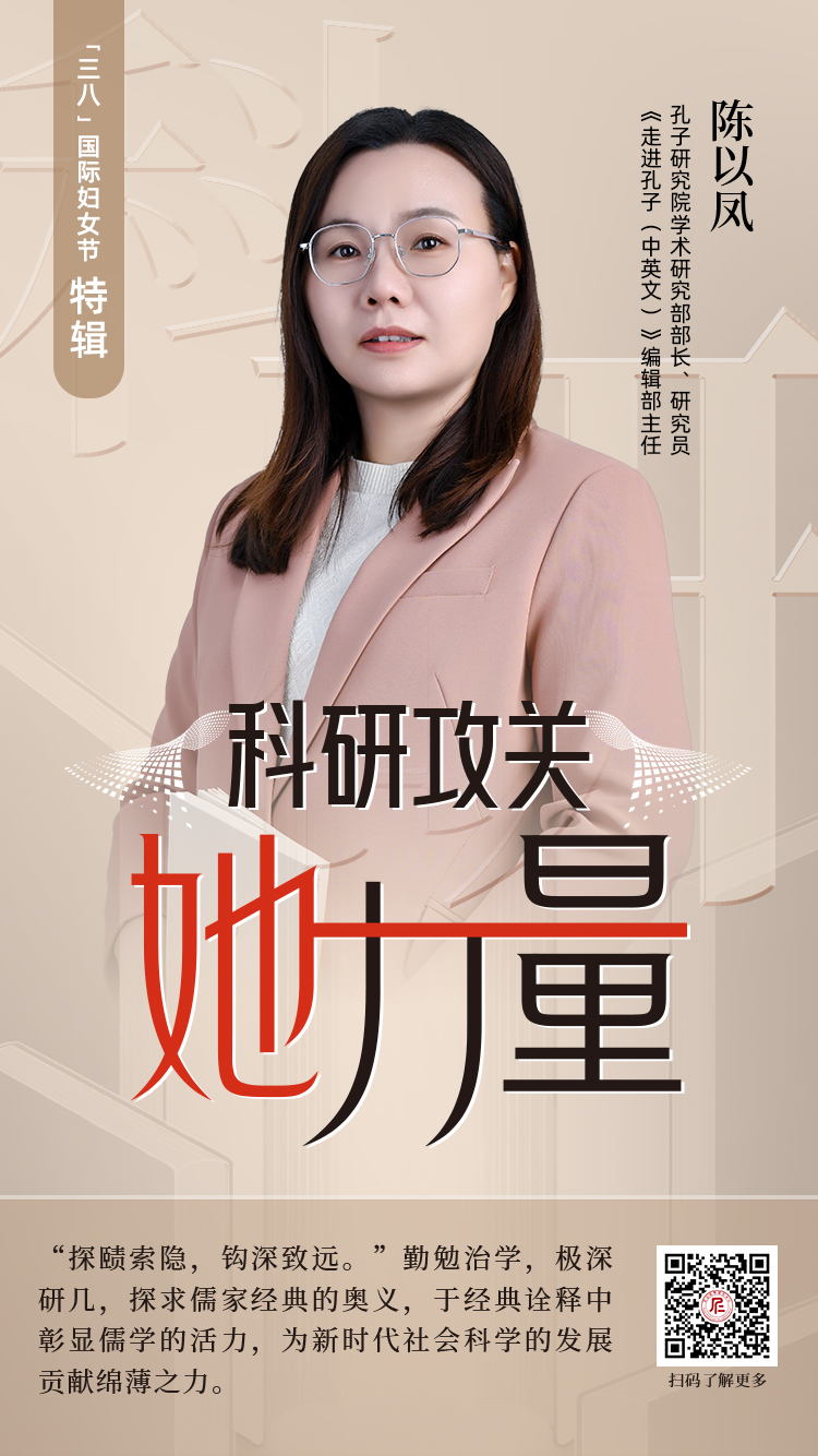 陈以凤,孔子研究院学术研究部部长、研究员,《走进孔子(中英文)》编辑部主任。她以其深厚的文献学功底,在儒家经典研究领域独树一帜。今年,她将以《春秋穀梁传》为突破口,全力推进“礼制与秩序:《春秋穀梁传》社会治理思想研究”等省级项目,期望以丰富的科研成果助力儒学中心的学术攻坚。她以“探赜索隐,钩深致远”激励自己不断探求儒家经典的奥义,彰显中华优秀传统文化的时代活力。