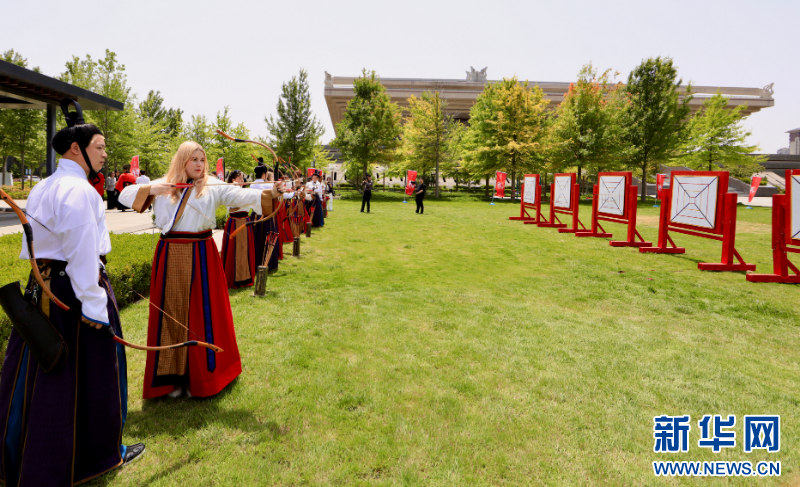 外国留学生在孔子博物馆体验传统“乡射礼”活动。新华网发(侯新建 摄)