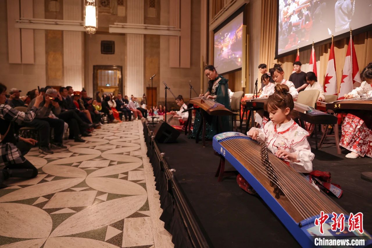 当地时间2024年11月25日,洋溢着浓郁“中国风”的第四届渥太华民乐戏曲文化节在加拿大渥太华国会礼堂举行。图为演员们表演筝鼓合奏《盛世国乐》。 中新社记者 余瑞冬摄