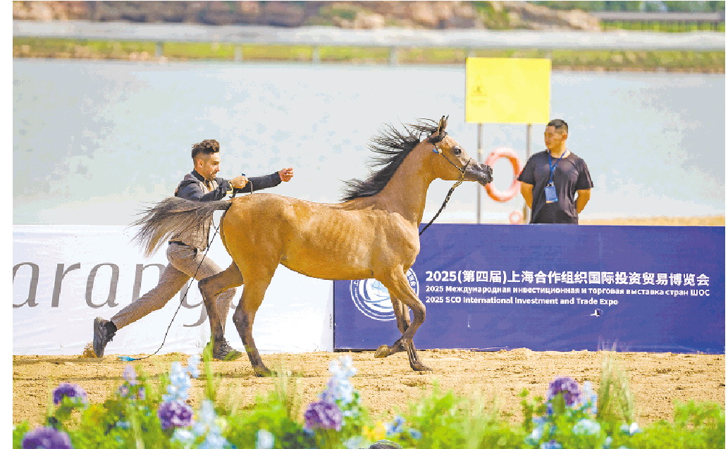 2025(第四届)上海合作组织国际投资贸易博览会配套活动——阿联酋阿拉伯马环球杯(中国站)上,牵马师正牵着阿拉伯马在比赛场地中奔跑。