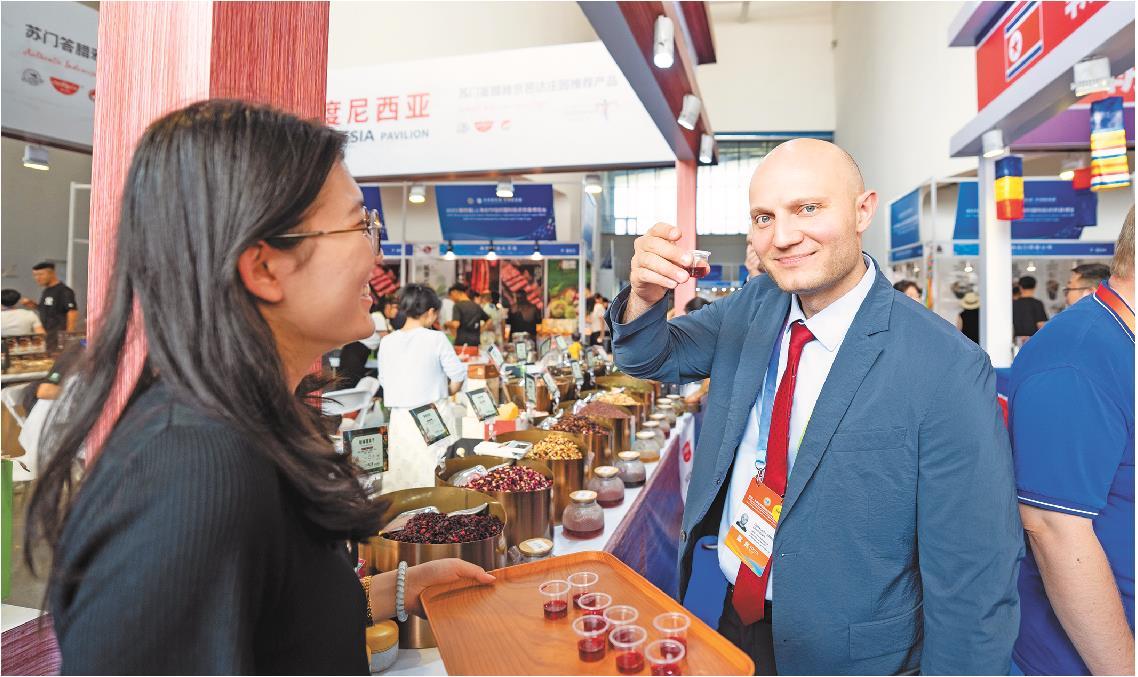 2025(第四届)上海合作组织国际投资贸易博览会上,来自俄罗斯的外宾巴沙正在品尝源自印尼的花茶。