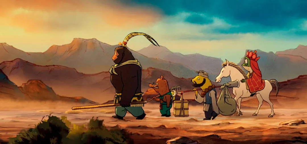 水墨氤氲的群山间,四个笨拙的小妖怪身披破旧袈裟,扛着自制的金箍棒、钉耙,在夕阳下踏上了荒诞的“取经路”。
