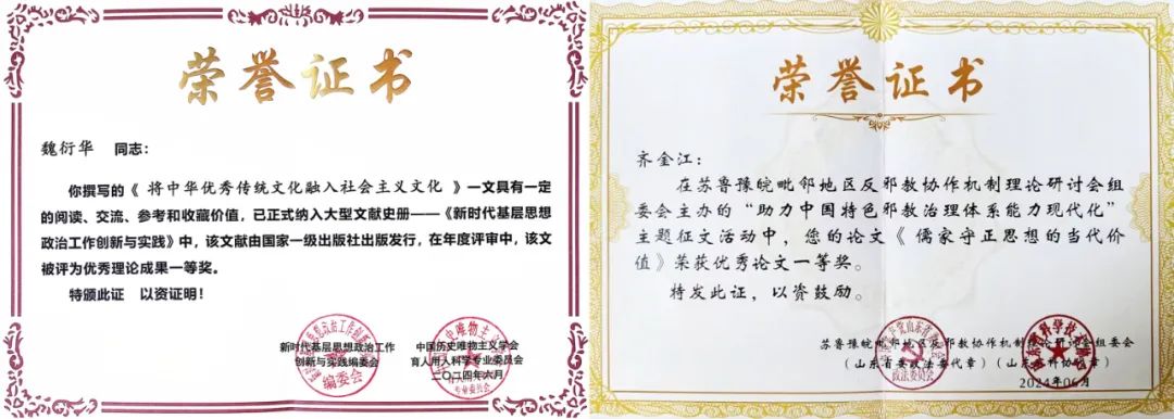 2024年以来,孔子研究院扎根儒学,潜心钻研,积极推动学术研究“登峰”,科研成果取得新进展,实现新突破,在《光明日报》《大众日报》《今日中国》等发表学术论文20余篇。其中,魏衍华研究员发表在《走进孔子(中英文)》的理论文章《将中华优秀传统文化融入社会主义文化》,被纳入大型文献史册《新时代基层思想政治工作创新与实践》,并获评优秀理论成果一等奖;齐金江研究员撰写的《儒家守正思想的当代价值》一文在苏鲁豫皖毗邻地区反邪教协作机制理论研讨会组委会主办的“助力中国特色邪教治理体系能力现代化”主题征文活动中荣获优秀论文一等奖。