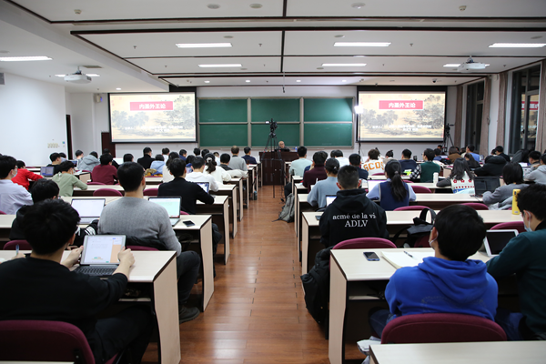 随后,八十七岁高龄的张立文教授为同学们进行第一讲授课。张教授以《内圣外王论》为主题,从“内圣外王说”“各正性命”“尽心知性”“性情中和”“霸王道杂”等五个部分加以详细阐释。张教授认为内圣外王是中国哲学理论思维的重要原理,是人的内在世界与外在世界、精神世界与事功世界的融合体,而与草木禽兽世界相区别。