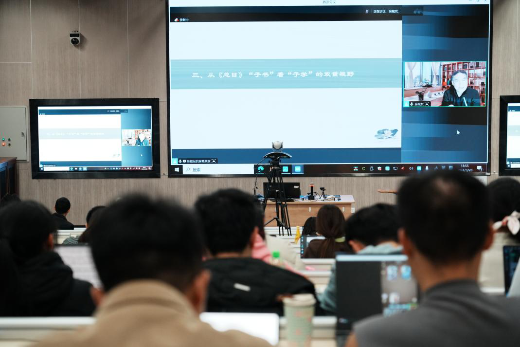 来源:中国人民大学哲学院 作者: 日期:2024-04-022024年3月28日,由尼山中华优秀传统文化联合研究生院和中国人民大学哲学院联合主办的中华优秀传统文化专项研究生共同课——“中华优秀传统文化新论”第四讲在中国人民大学公教一楼1102教室顺利举行。课程采取线上线下相结合的方式,在腾讯会议、中国人民大学哲学院B站账号进行直播。本场讲座由武汉大学哲学学院吴根友教授主讲,中国人民大学哲学院刘增光副教授主持,主题是“子学的双重视野与当代中国哲学创新”。
