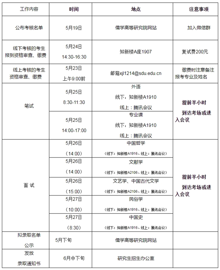 山东大学儒学高等研究院2021年招收博士研究生考核工作进程表(儒学专项计划)