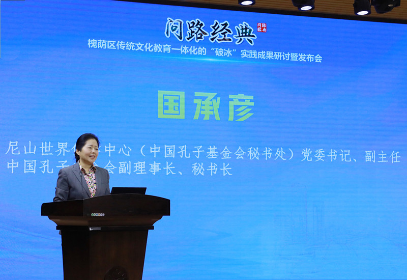 国承彦首先代表尼山世界儒学中心、中国孔子基金会,对槐荫区传承中华优秀传统文化、推动教育工作融入“两创”20年的坚守与实践所取得的成绩表示祝贺。她在致辞中表示,近年来槐荫区在传承中华优秀传统文化方面做了大量卓有成效的工作,以经典为桥,推动传统文化和常规课堂教育“一体化”,经过20年的坚守与实践,实现中、小、幼各学段传统文化教育的引桥衔接,经典文化主题活动异彩纷呈,取得了一系列理论和实践成果。尼山世界儒学中心(中国孔子基金会)实体化运行三年来,以传承弘扬中华优秀传统文化为己任,致力打造世界儒学人才集聚和培养高地、儒学研究高地、儒学普及推广高地、儒学国际交流传播高地,各项工作取得显著成效,创设孔子学堂3200余家,推出公益公开课尼山讲堂、高端对话节目尼山杏坛,举办全国儒家经典跨语言诵读大会、山东省儒家经典跨语言诵读大赛等一系列品牌活动,推动中华优秀传统文化“两创”落实落地。国承彦诚挚邀请槐荫区学子积极参加儒学中心、孔子基金会举办的丰富活动,希望槐荫区继续发挥54家孔子学堂的引领作用,持续扩大规模,共同传习中华经典,推进优秀传统文化深入校园、融入社会。