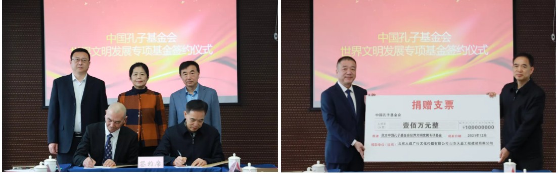 1月20日上午,中国孔子基金会世界文明发展专项基金签约仪式在济南举行。尼山世界儒学中心(中国孔子基金会秘书处)党委书记、副主任,中国孔子基金会副理事长、秘书长国承彦,金裕控股集团董事局主席马建勋,中国贸促会济南市分会党组书记、会长张喆出席活动并发表重要讲话。