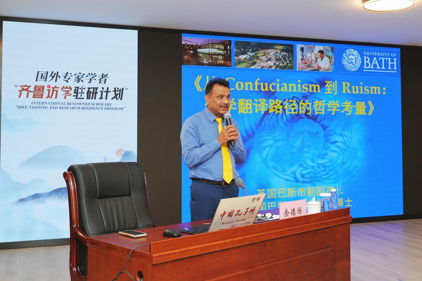 7月31日,尼山世界儒学中心(中国孔子基金会秘书处)举办国际前沿学术讲座(第5期)。“齐鲁访学驻研计划”访问学者,英国巴斯大学中国政治、语言与国际研究系课程主任兼高级学者余德烁以“儒学翻译路径的哲学考量”为题开讲。