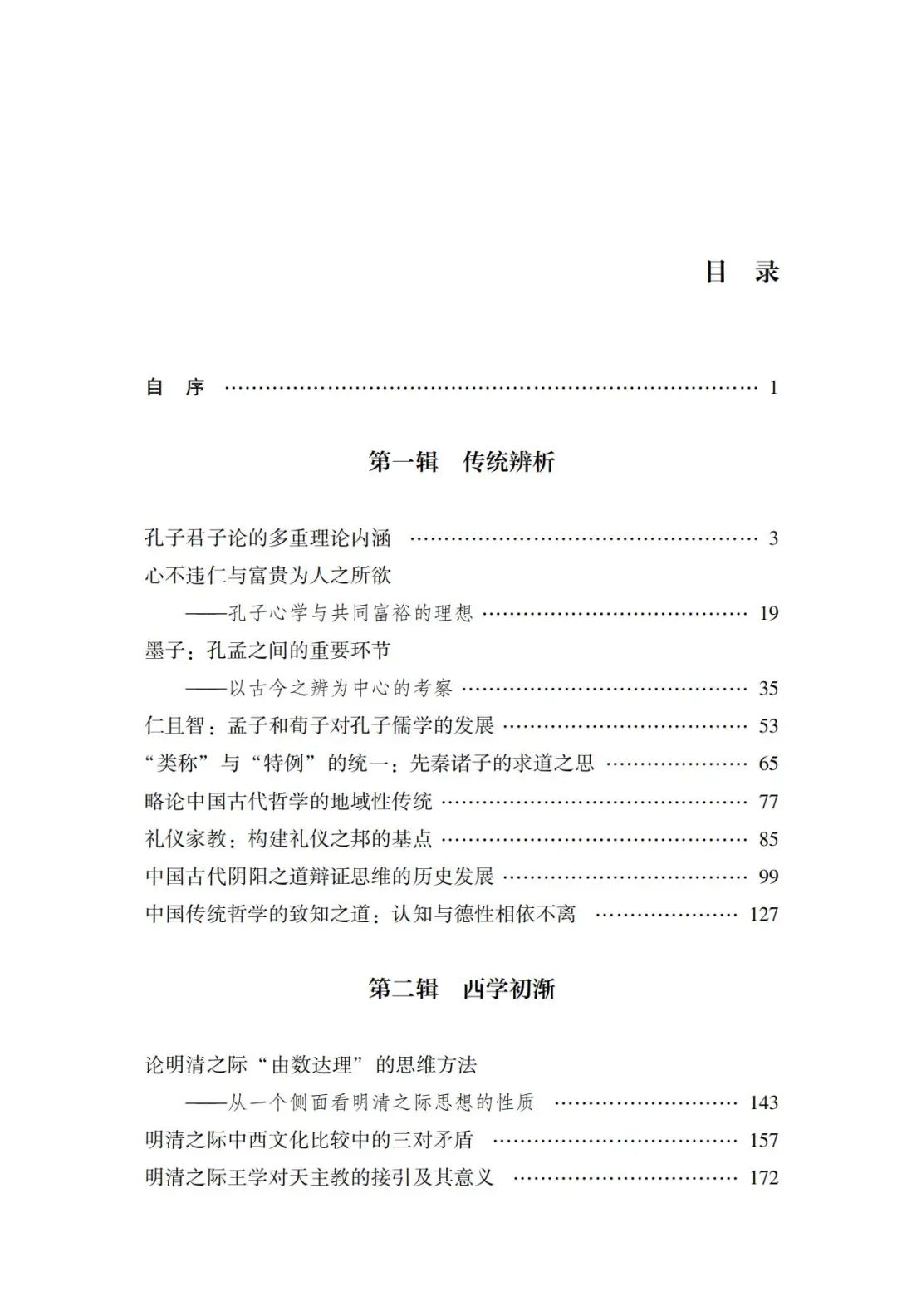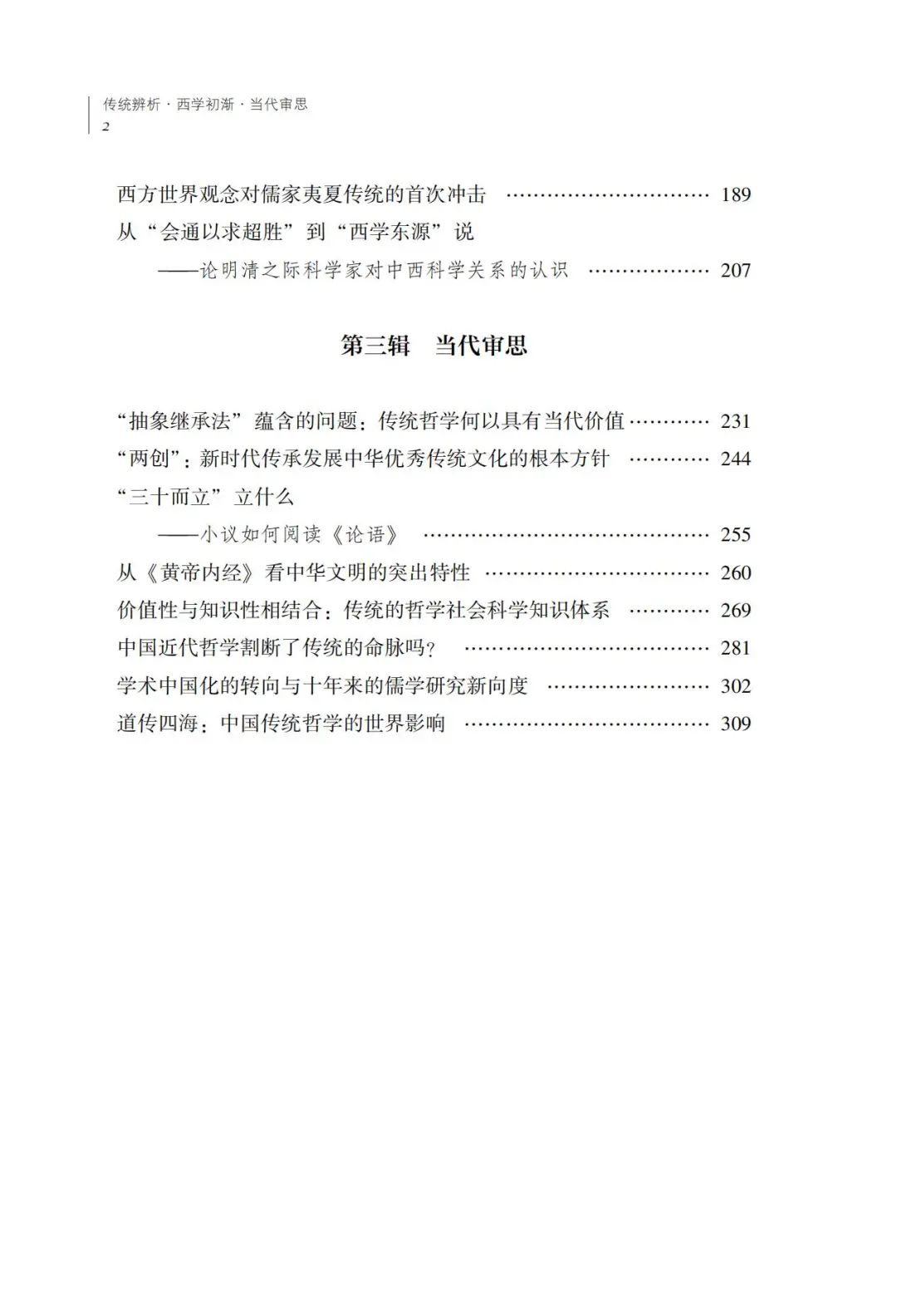 本书是关于儒学和传统思想的论文集。按照内容分为三辑,第一辑传统辨析,共九篇文章,前四篇是个案分析,后五篇是专题综论;第二辑西学初渐,共五篇文章,论述了明清之际西学初次影响中国对原有传统的冲击,以及不同观念的比照和交汇;第三辑当代审思,共八篇文章,论述了传统文化在当代中国创造性转化和创新性发展的若干问题。